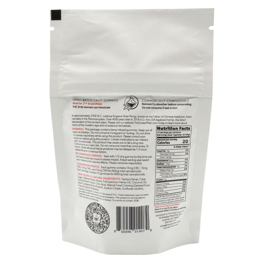 - Potent Dose: Each gummy contains 15mg CBC, 15mg CBD, 15mg CBG, and 15mg CBN totaling 60mg per gummy.