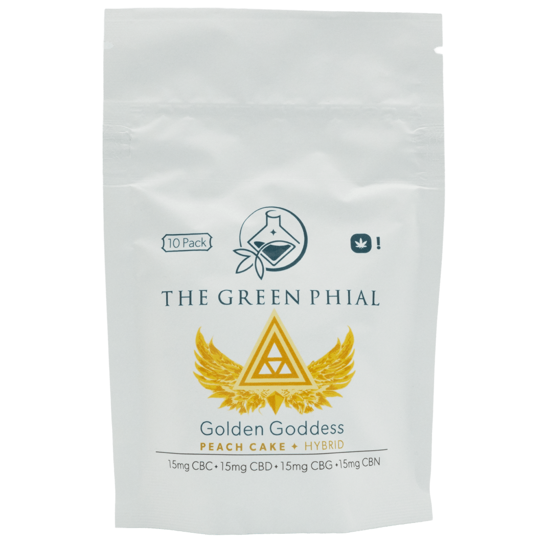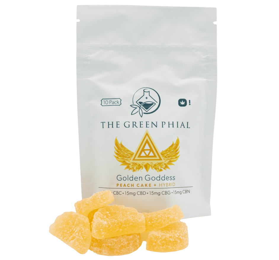 The Green Phial Hybrid CBD Gummies – Golden Goddess are vegan, all natural, nano-emulsified, full-spectrum, hemp infused edibles that provide maximum bioavailability. These small batch gummies contain a phytocannabinoid rich blend of 15mg CBC, 15mg CBD, 15mg CBG, and 15mg CBN per gummy.