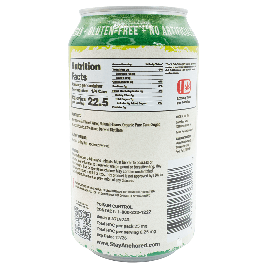 Anchored Delta 9 Soda Lemon Lime is a familiar refreshing lemon and lime flavor, infused with 25mg of Delta 9 THC. The Anchored Delta 9 Soda Lemon Lime offers a refreshing and comforting taste experience while delivering the potential relaxing and mood-enhancing effects of Delta 9 THC. Each can is crafted to provide a perfect balance of classic flavors and cannabinoid benefits.