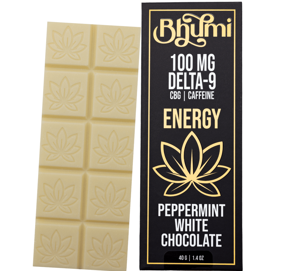 Bhumi’s Delta 9 White Chocolate Bar – Peppermint combines the refreshing taste of peppermint with the smoothness of white chocolate. Each bar contains 75mg of Delta 9 THC, 150mg of CBG, and 350mg of caffeine, providing a balanced and invigorating experience.