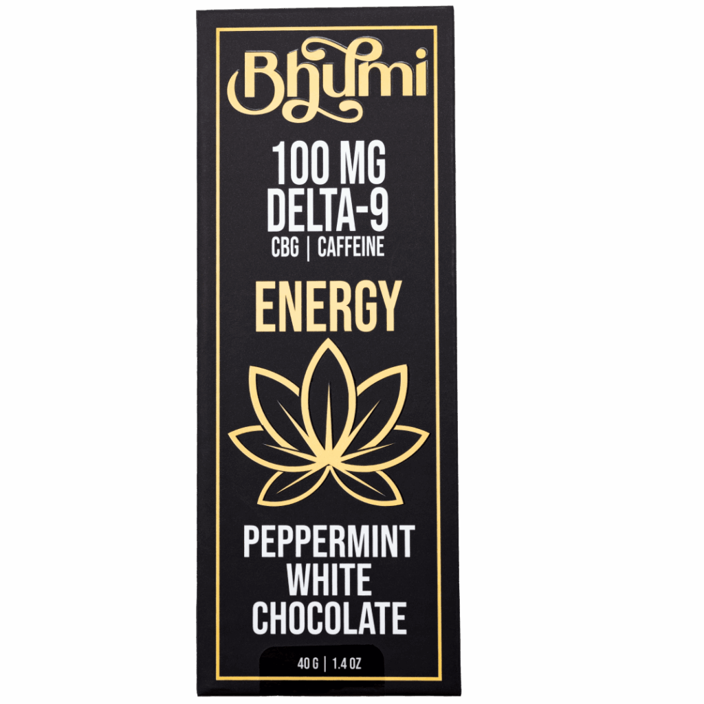 Bhumi’s Delta 9 White Chocolate Bar – Peppermint combines the refreshing taste of peppermint with the smoothness of white chocolate. Each bar contains 75mg of Delta 9 THC, 150mg of CBG, and 350mg of caffeine, providing a balanced and invigorating experience.