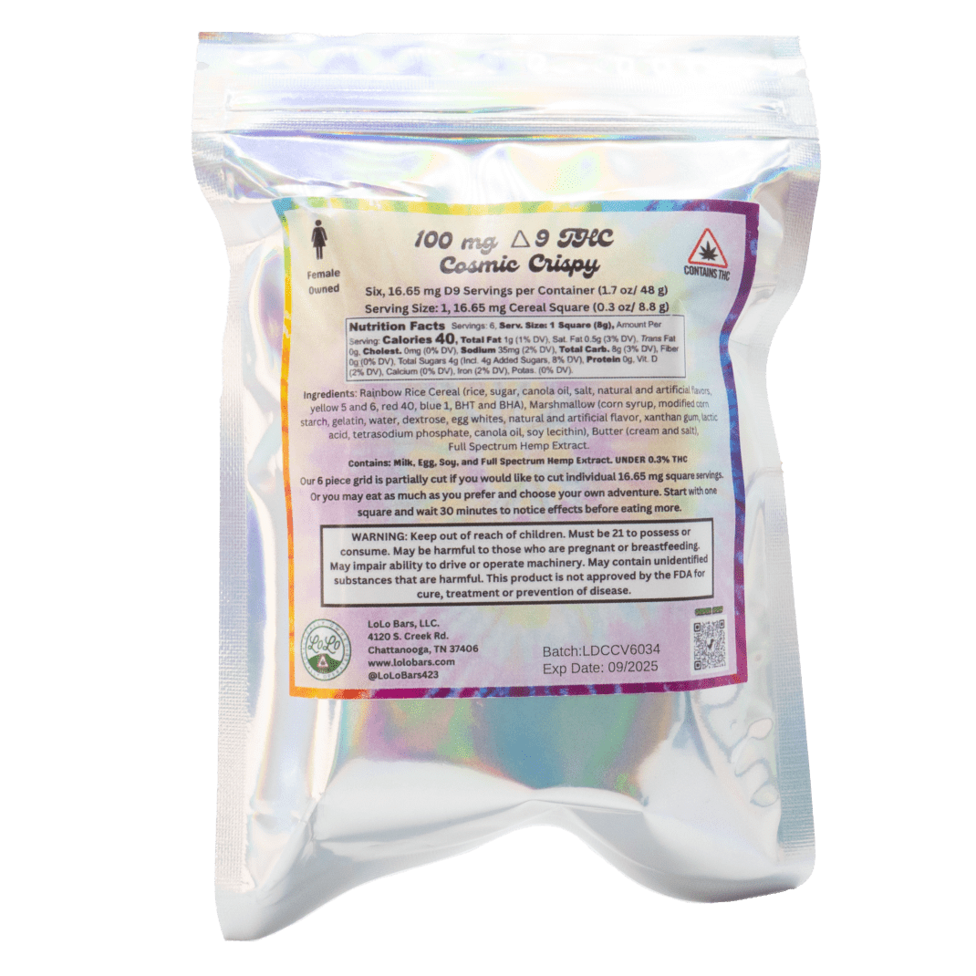 LoLo Bars Delta 9 Rice Crispy delivers a familiar, satisfying crunch infused with 100mg of Delta 9 THC. Each bar is divided into six portions, with roughly 16.65mg per serving, offering a dependable and measured dose.