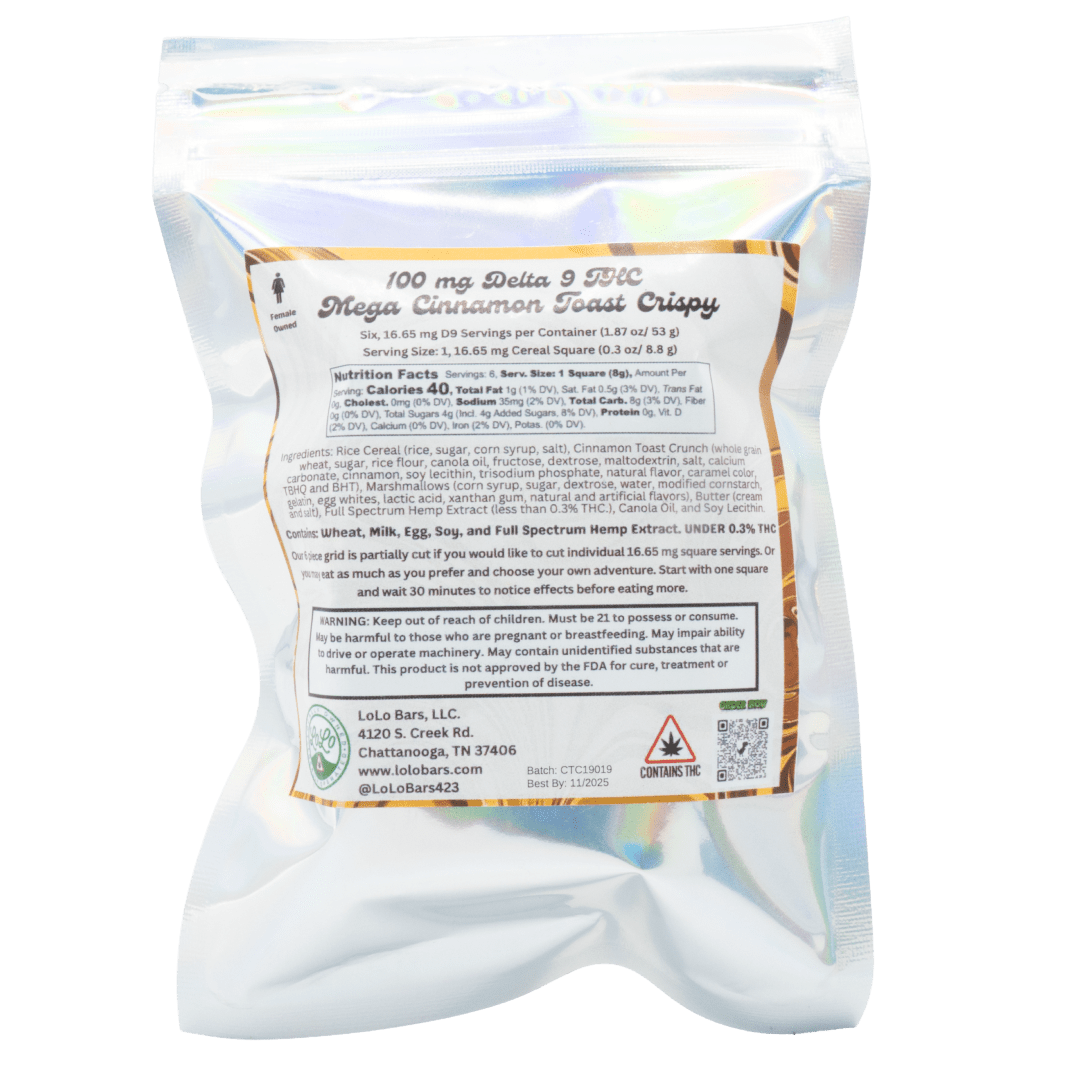 LoLo Bars Delta 9 Rice Crispy delivers a familiar, satisfying crunch infused with 100mg of Delta 9 THC. Each bar is divided into six portions, with roughly 16.65mg per serving, offering a dependable and measured dose.
