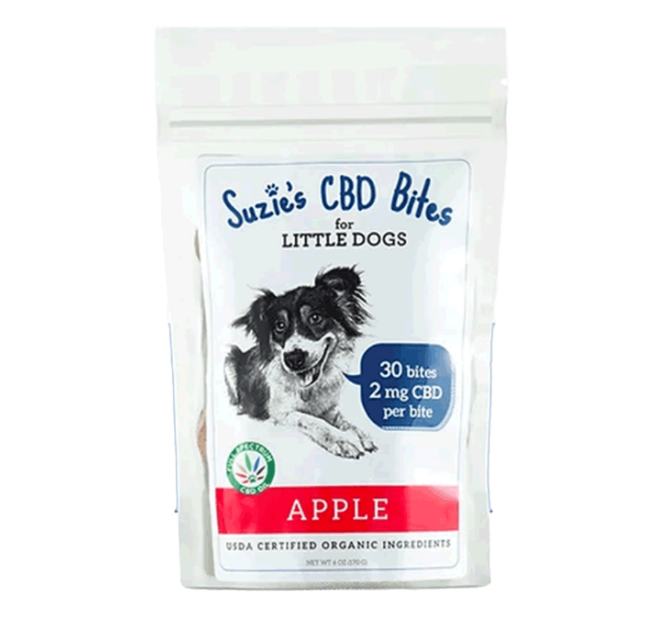 Dosage: 2mg of CBD per treat, 30 treats per pack.Benefits of Suzie’s CBD Dog Treats: Apple Hearts 2mg 30pk