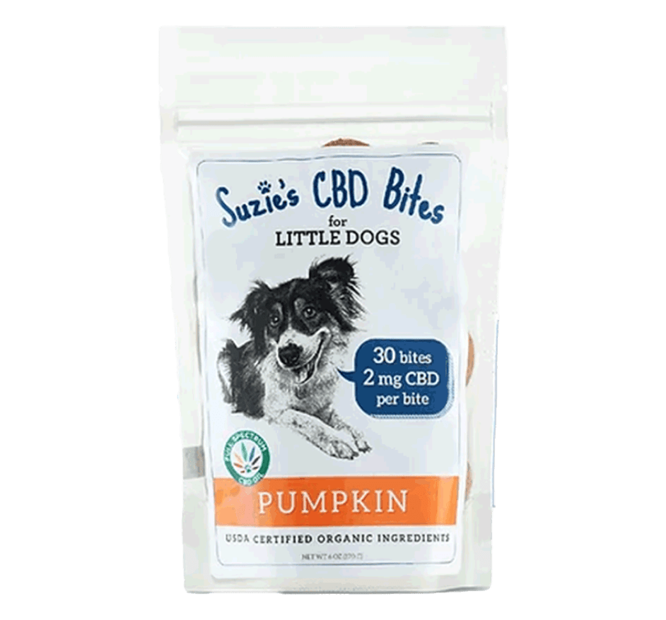 Dosage: 2mg of CBD per treat, 30 treats per pack.Benefits of Suzie’s CBD Dog Treats: Pumpkin Hearts 2mg 30pk