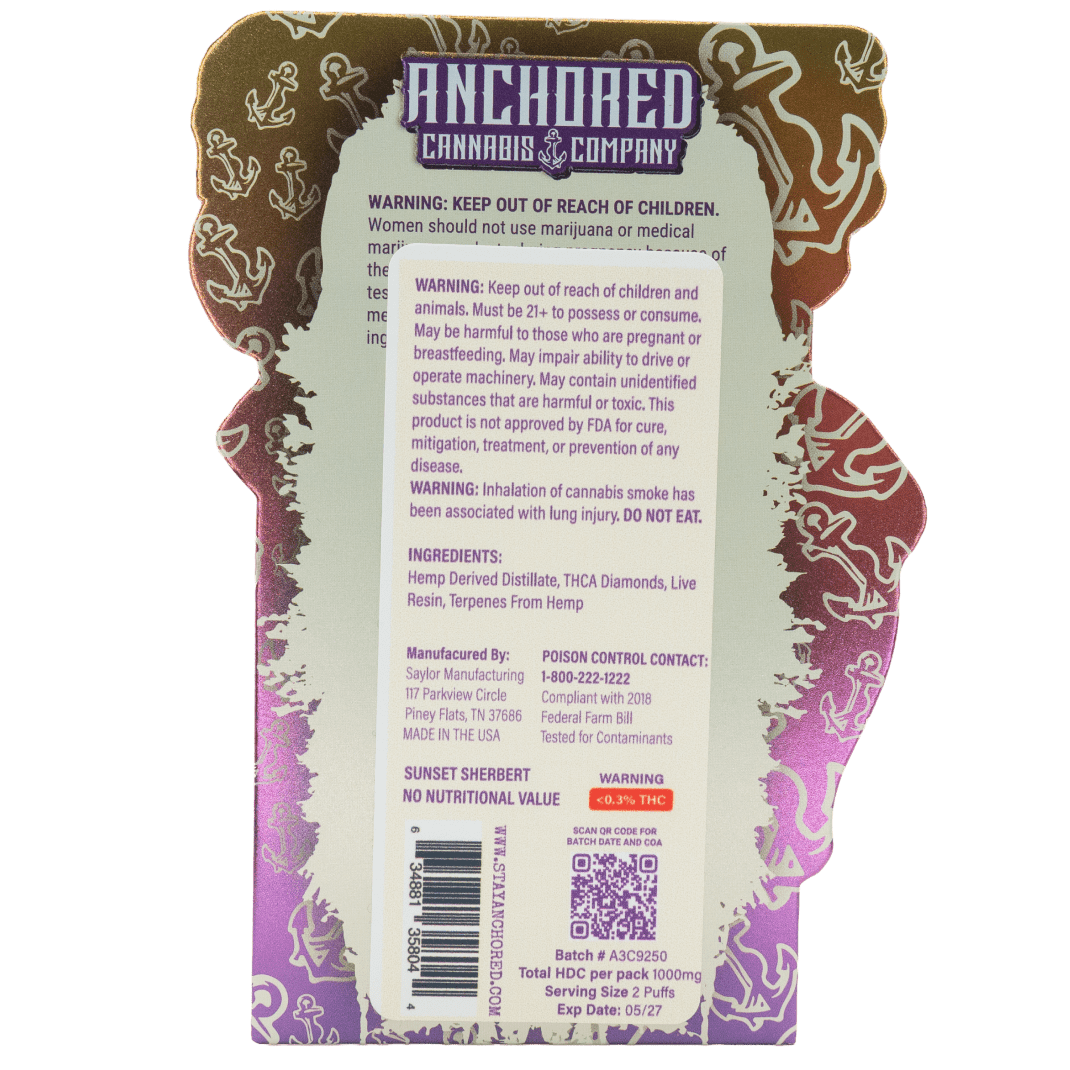 Anchored’s Sunset Sherbert THCA Cart is designed for ultimate convenience and discretion. Its compact size and seamless portability make it easy to enjoy anytime, while the smooth, flavorful vapor ensures a subtle and enjoyable experience wherever you are.