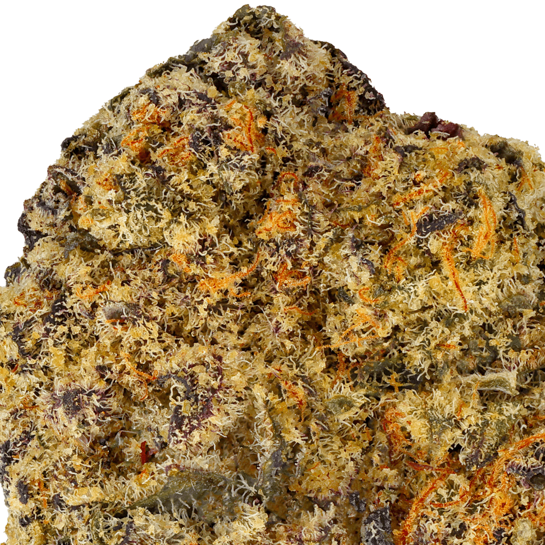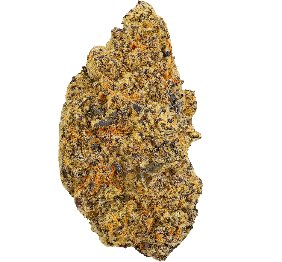 - Appearance: Dense, light green and purple buds with orange hairs and golden/white trichomes
