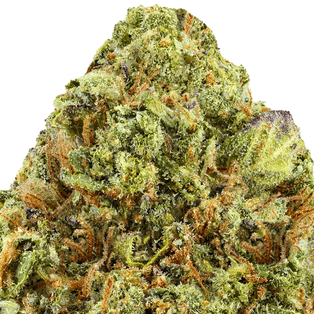 - Appearance: Dense, light green and purple buds with orange hairs and golden/white trichomes