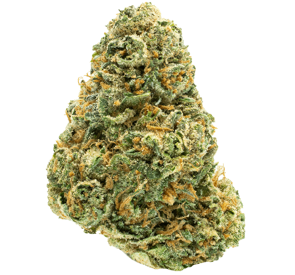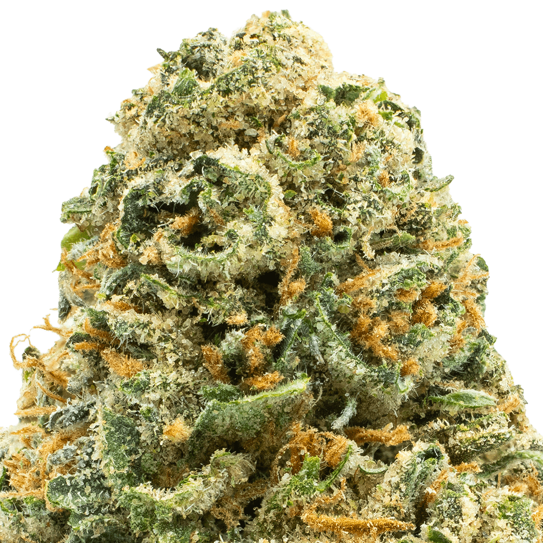 Our Mochi THCA flower is a hybrid cannabis strain, created by combining Sunset Sherbet and Thin Mint Girl Scout Cookies. The buds are light green, dense, and covered in vibrant orange hairs, with golden and white trichomes.