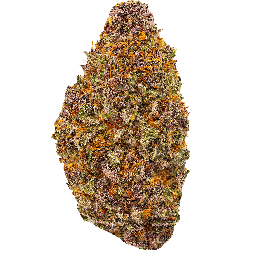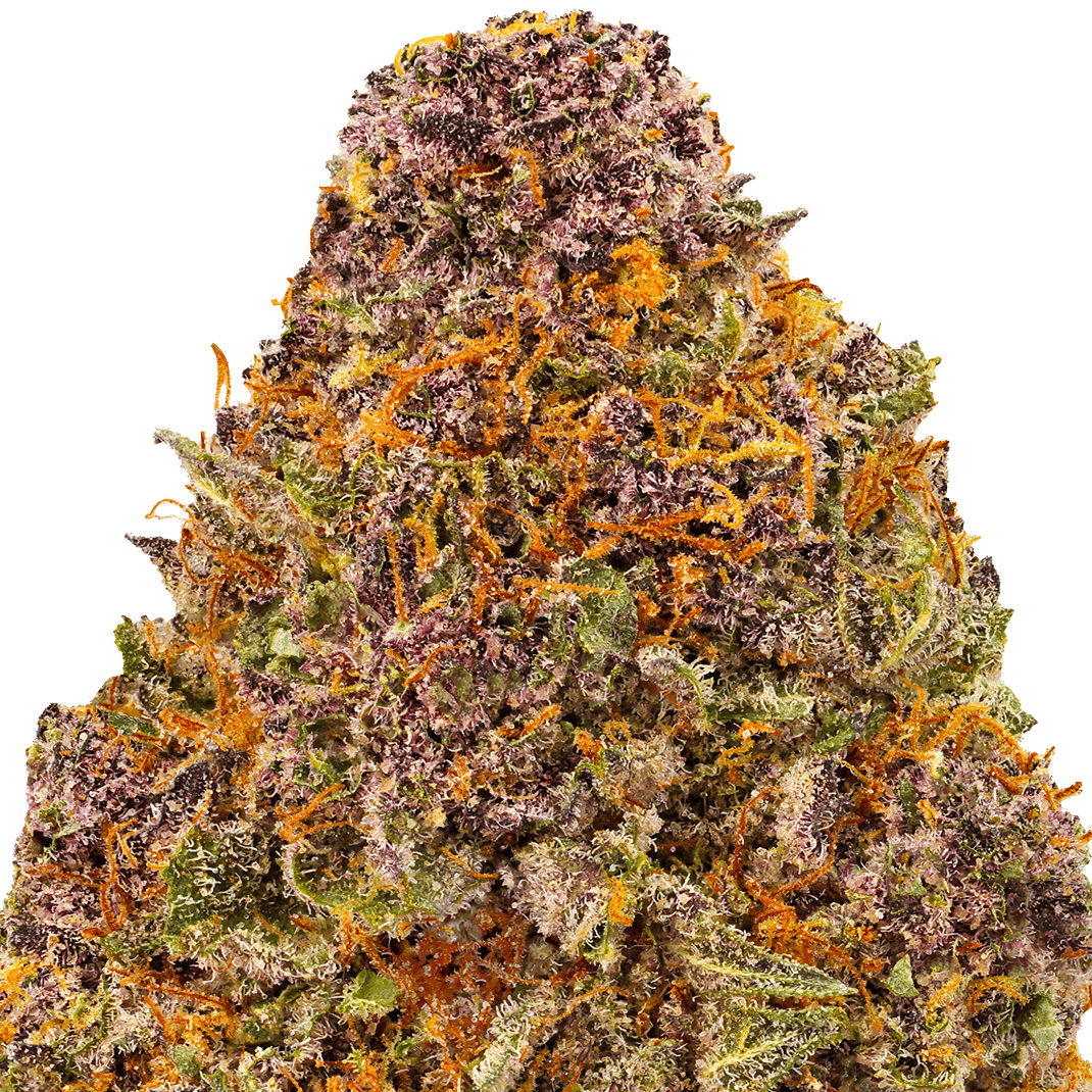 Our Trainwreck strain of THCA flower is a potent sativa cannabis strain, created by crossing Mexican and Thai sativas with Afghani indicas. The buds are light green and very purple, dense, and covered in vibrant orange hairs, with golden and white trichomes.