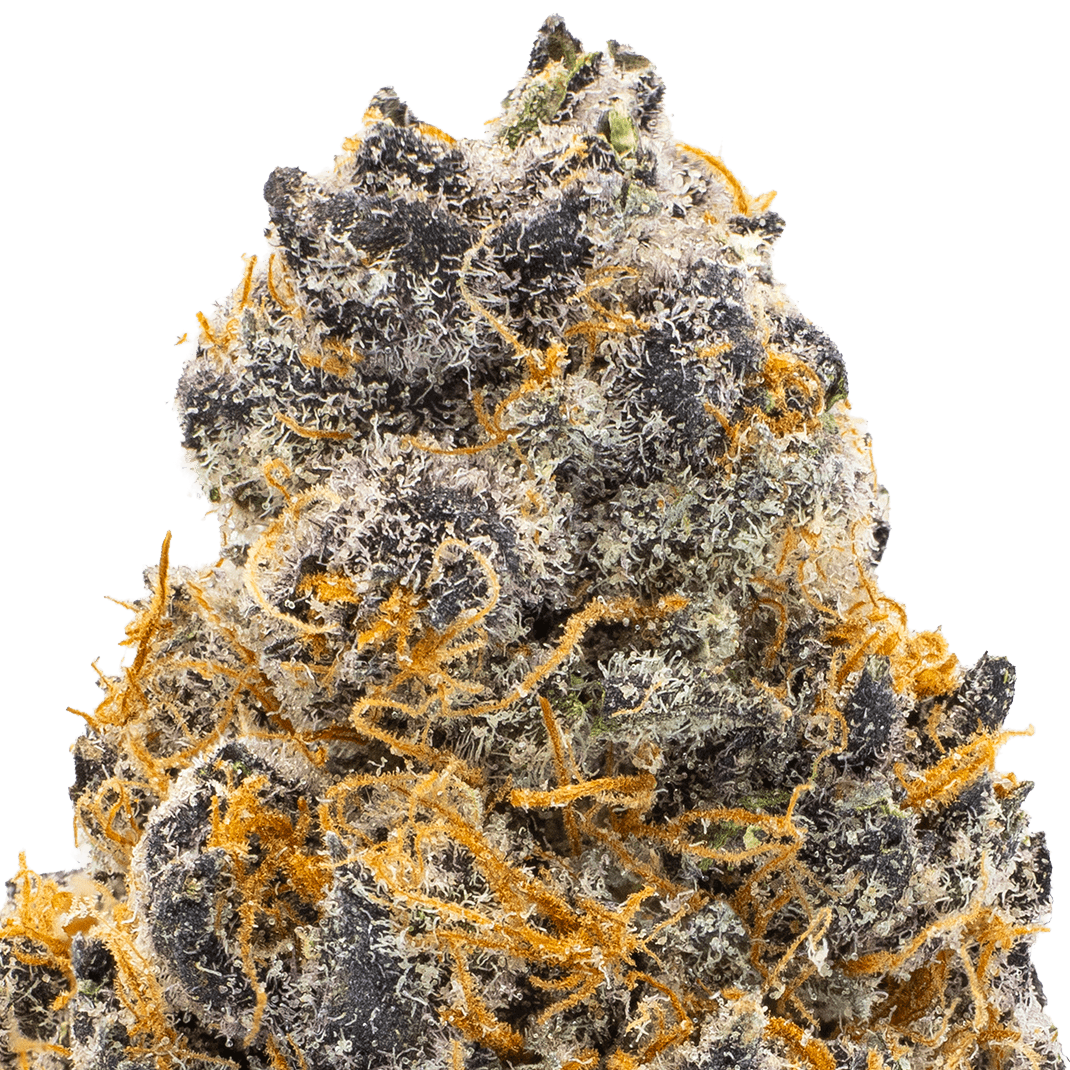 - Appearance: Dark purple and green, dense buds with golden and white trichomes