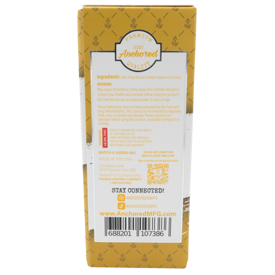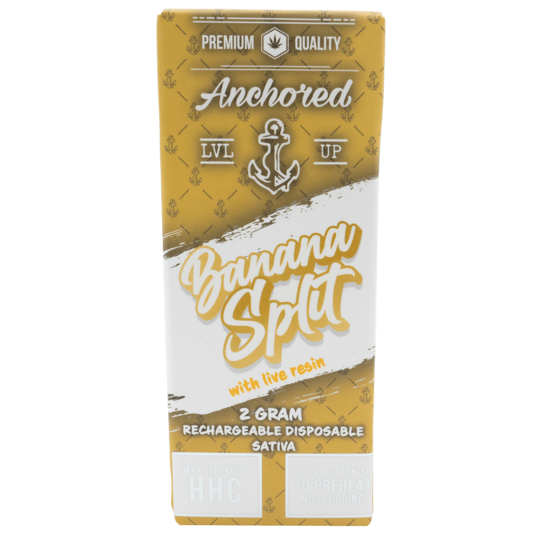 Anchored – 2 Gram HHC Disposable Vape in ‘Banana Split’ is designed for a delightful vaping experience, offering a combination of rich flavors and relaxation.