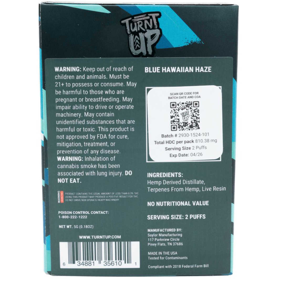 Convenience meets quality as the Turnt Up 5 Gram THCP vape offers a hassle-free and user-friendly experience. With its compact design and easy-to-use functionality, you can enjoy the Blue Hawaiian Haze strain on the go, anytime, anywhere.