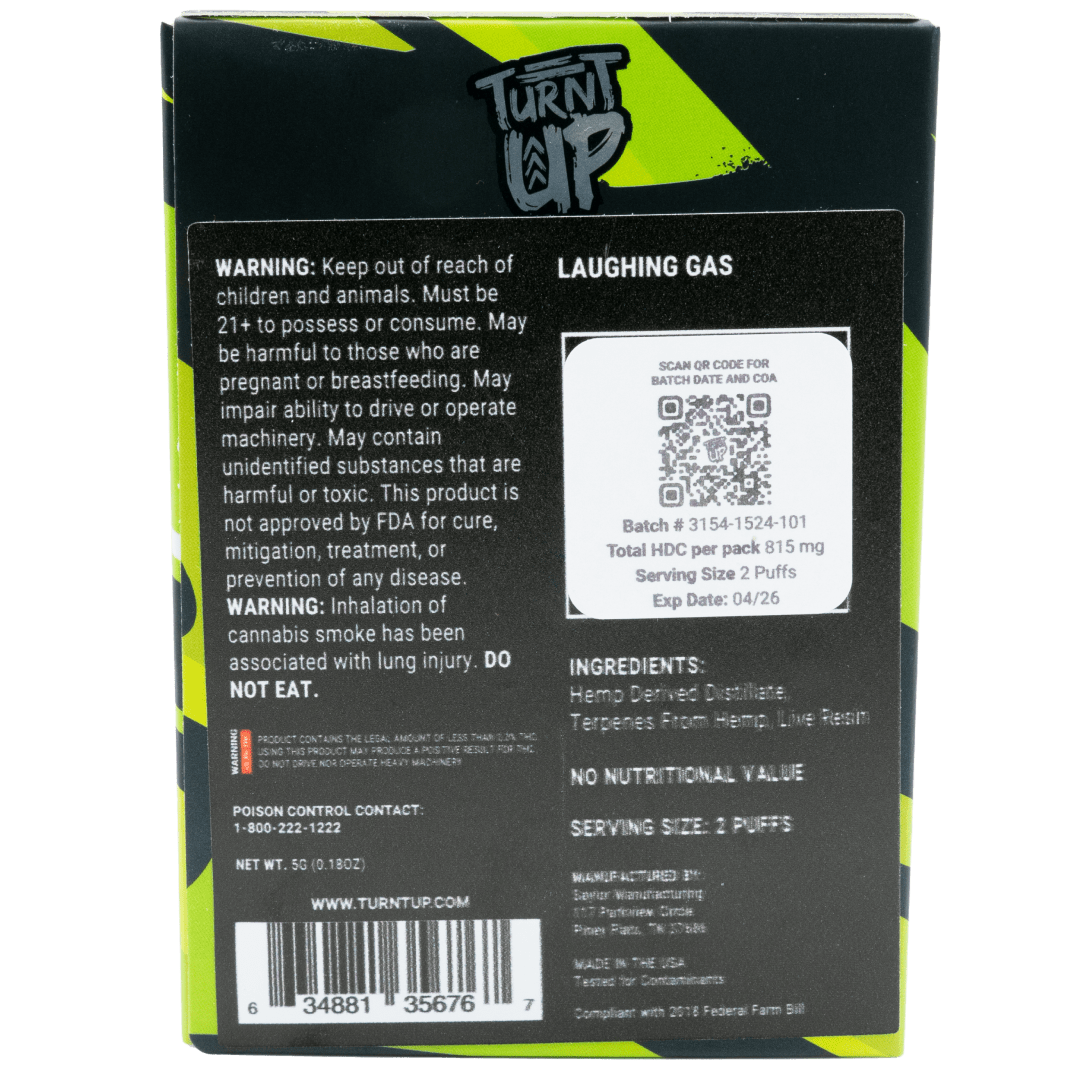 Convenience meets quality as the Turnt Up 5 Gram THCP vape offers a hassle-free and user-friendly experience. With its compact design and easy-to-use functionality, you can enjoy the Laughing Gas strain on the go, anytime, anywhere.